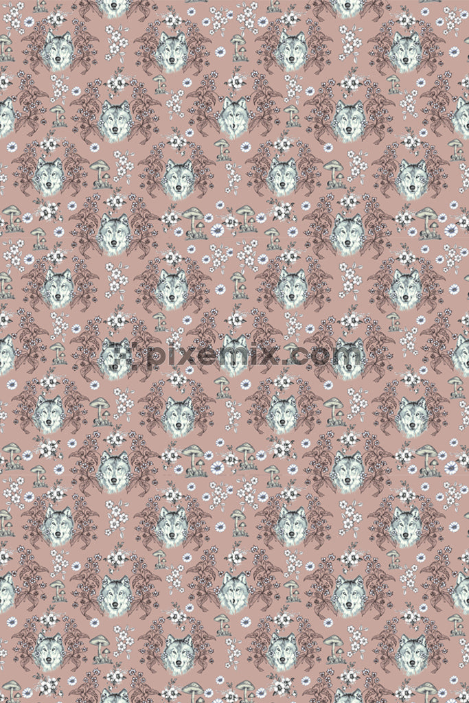 Produktgrafiken mit floralem Wolf-Muster und nahtlosem Wiederholungsmuster