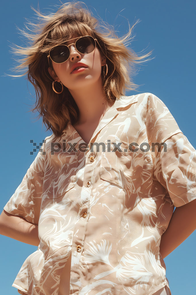 Trendy woman in sunglasses and floral shirt posing outdoors under clear blue summer sky stock image.