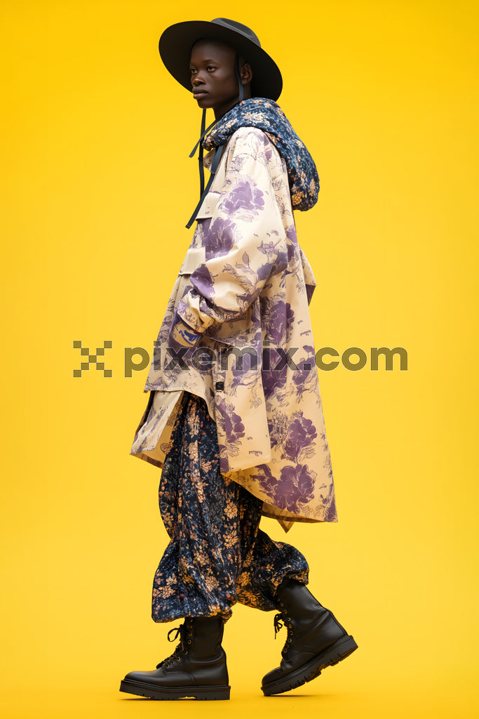 Fashion-forward individual in floral streetwear and wide-brim hat poses against a vibrant yellow backdrop.