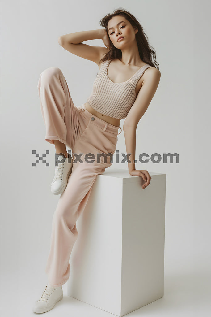 Modern fashion model in nude-toned outfit posing on white pedestal, minimalistic style studio portrait.