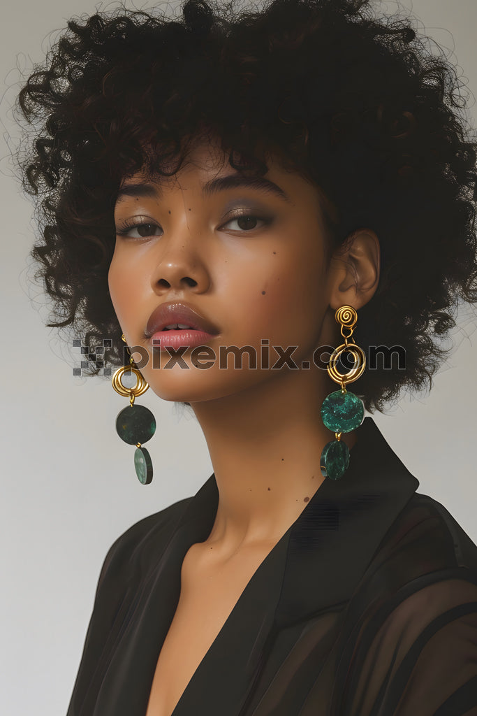 Elegant woman with voluminous curls wearing statement green gemstone earrings and sheer black blouse.