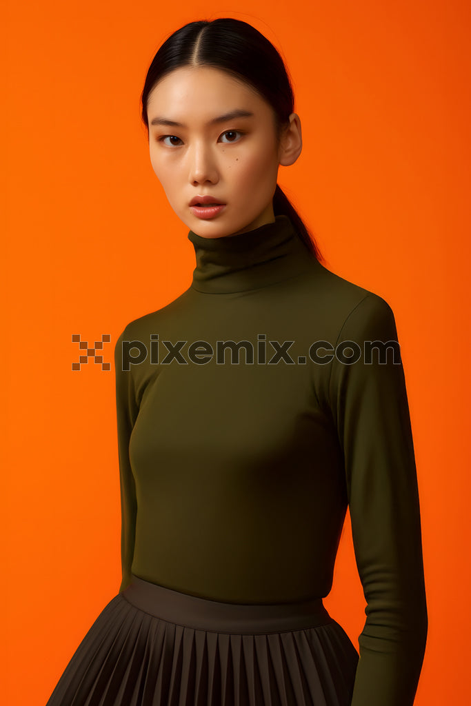 Elegant model in olive green turtleneck against vibrant orange backdrop in minimalist fashion portrait.