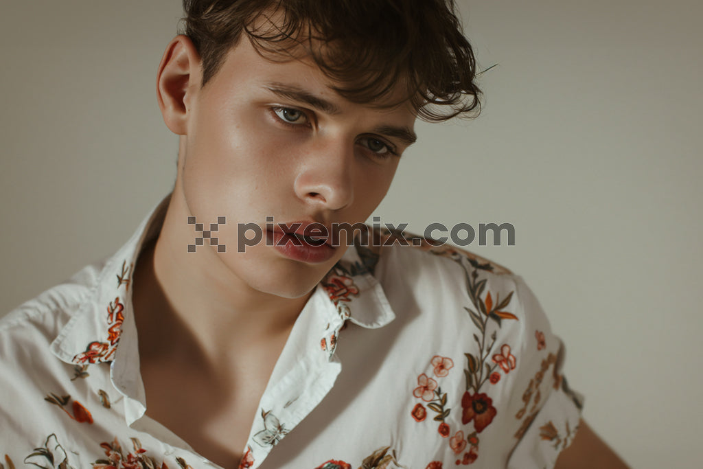 Stylish young man in floral shirt posing with soft expression and moody indoor lighting.