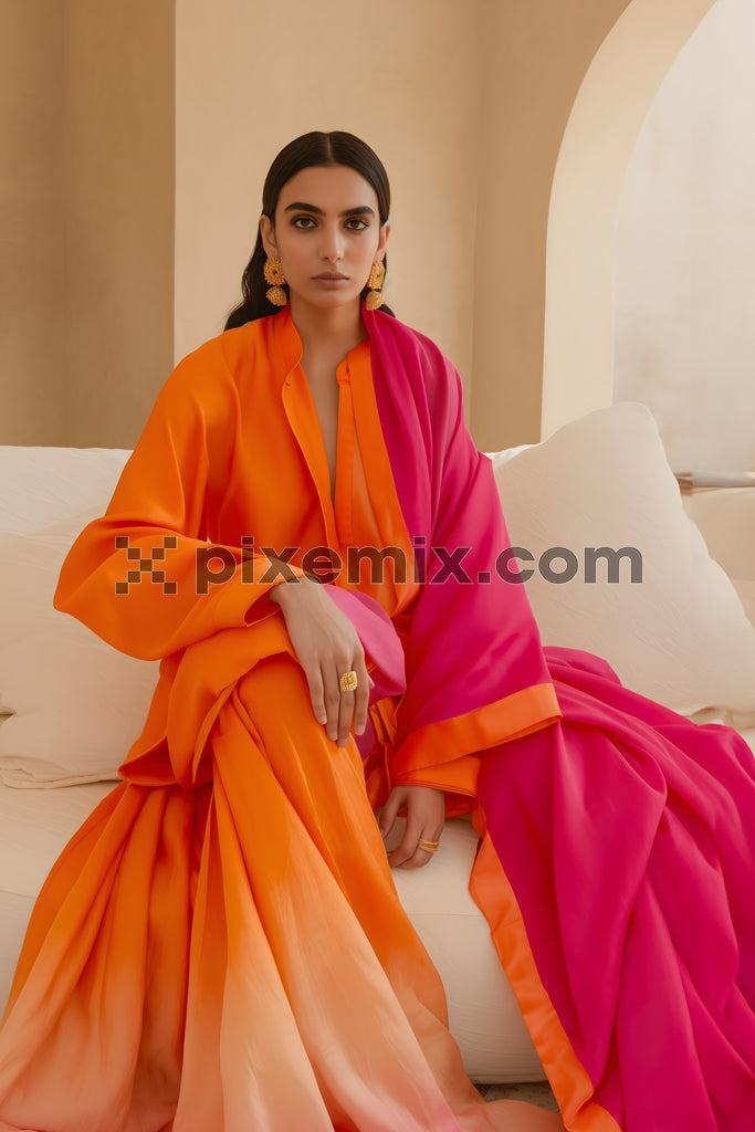 Elegant woman in vibrant orange and fuchsia draped attire seated in a soft neutral interior.