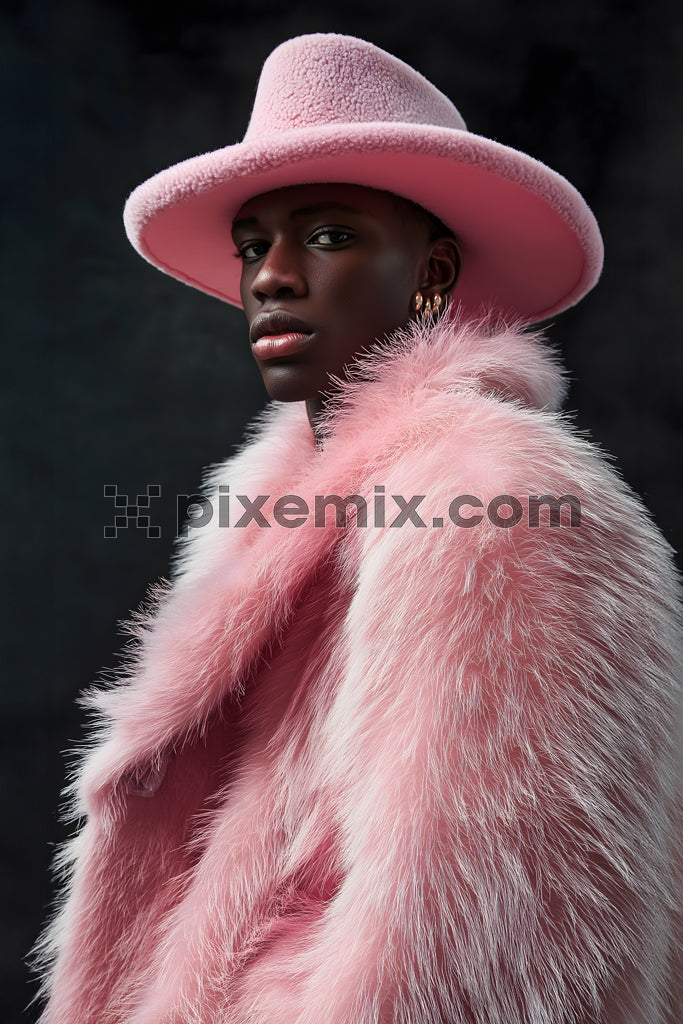 Confident fashion model in pink faux fur coat and wide hat posing against a dark background.