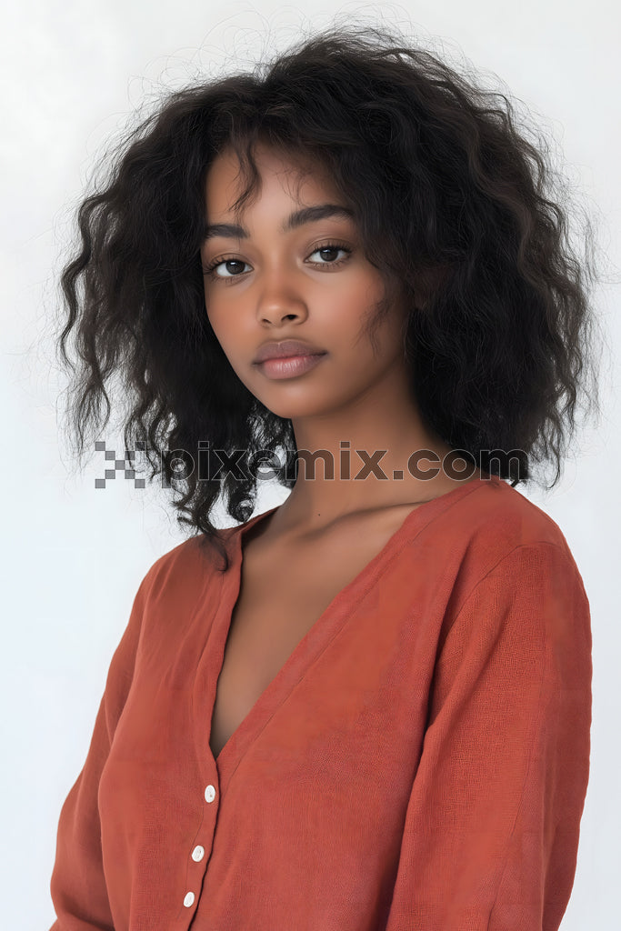 Portrait of a confident young woman with natural curls wearing a rust-colored buttoned blouse.