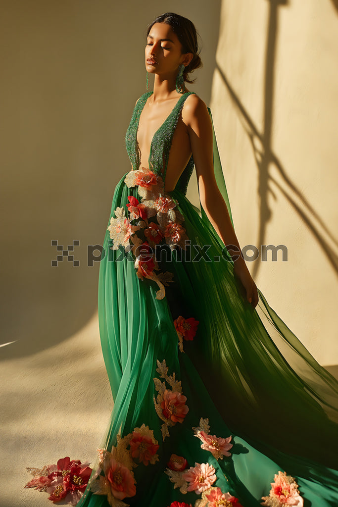 Elegant woman in deep green floral gown with plunging neckline bathed in golden sunlight.