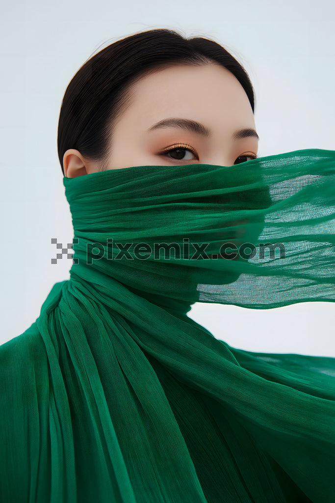 Woman in green sheer fabric with dramatic eye makeup and elegant fashion styling.