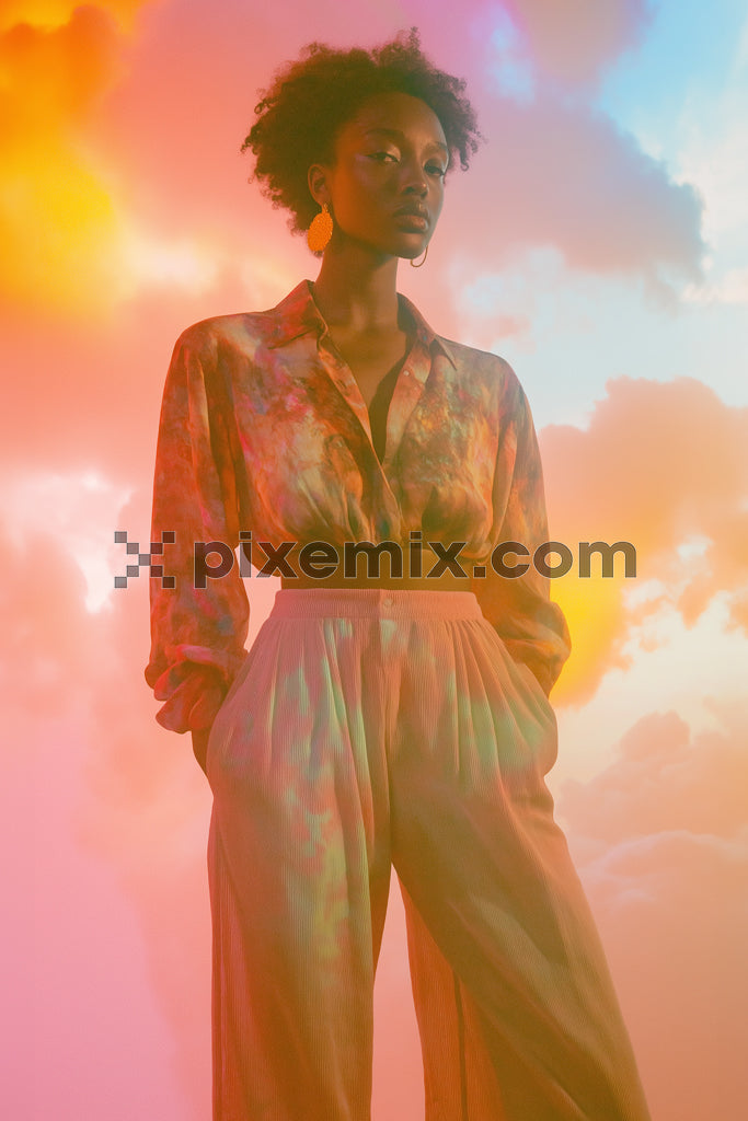Dreamy fashion editorial with colorful lighting, radiant clouds, and vibrant, flowy outfit in surreal ambiance.