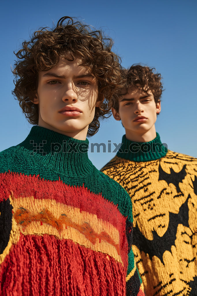 Two male models in bold textured knit sweaters posing outdoors under clear blue sky fashion shoot.