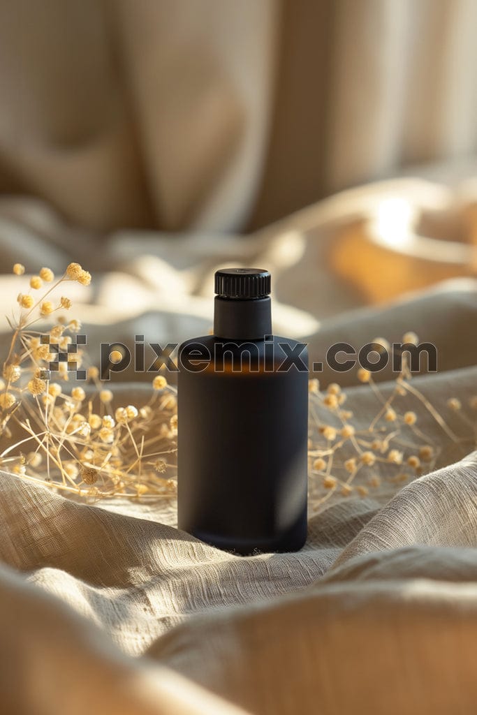 Schwarze Plastikflasche auf braunem Stoffbild.