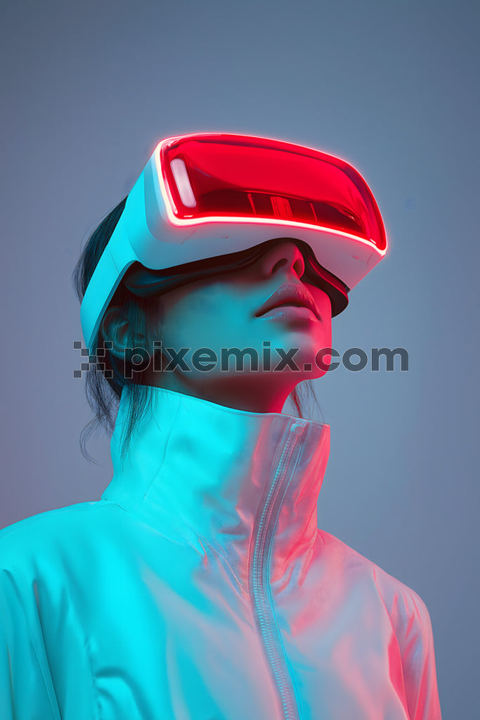Futuristic woman in glowing VR headset and neon jacket exploring virtual reality in cyberpunk style.