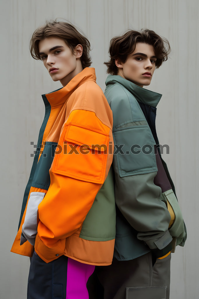Stylish young male models in colorful streetwear jackets posing back to back in urban setting.