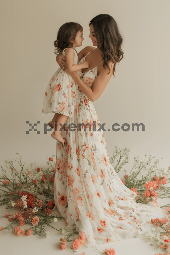 Mother and daughter in matching floral dresses sharing a joyful moment in a flower-themed setting.