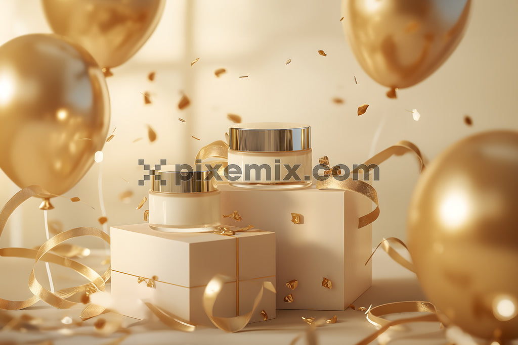 Luxury skincare gift set with golden balloons, confetti, and festive packaging in a soft celebration setup.