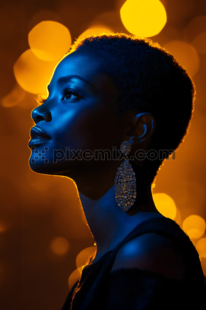 Elegant woman in dramatic blue lighting with sparkling earrings and golden bokeh background.