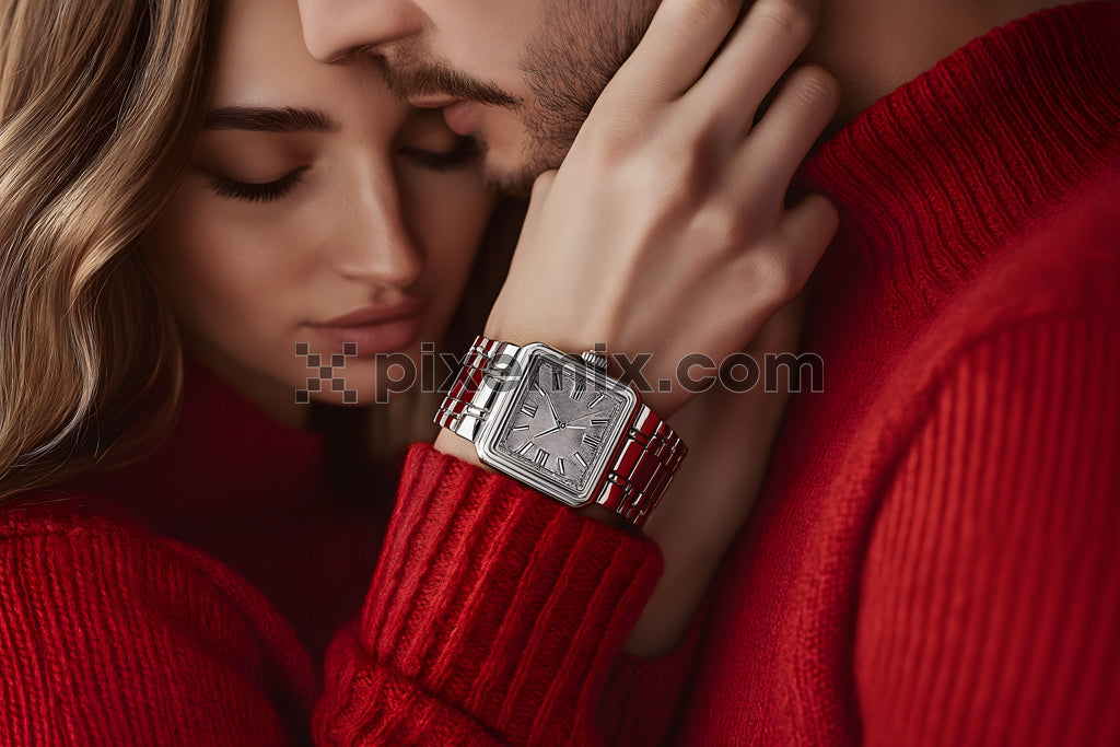 Romantic couple in red sweaters showcasing a luxury silver wristwatch stock image.