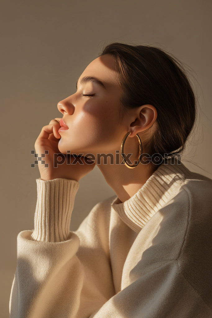 Golden hour portrait of woman in cozy sweater with gold hoop earrings stock image.