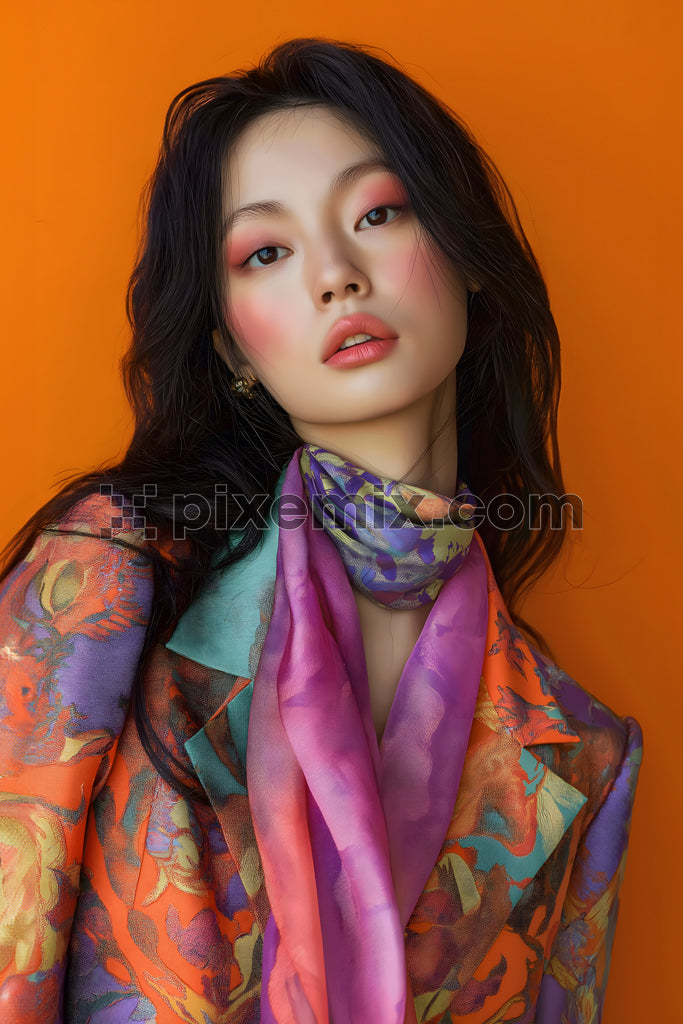 Stylish woman in vibrant floral outfit with colorful scarf posing against bold orange background.
