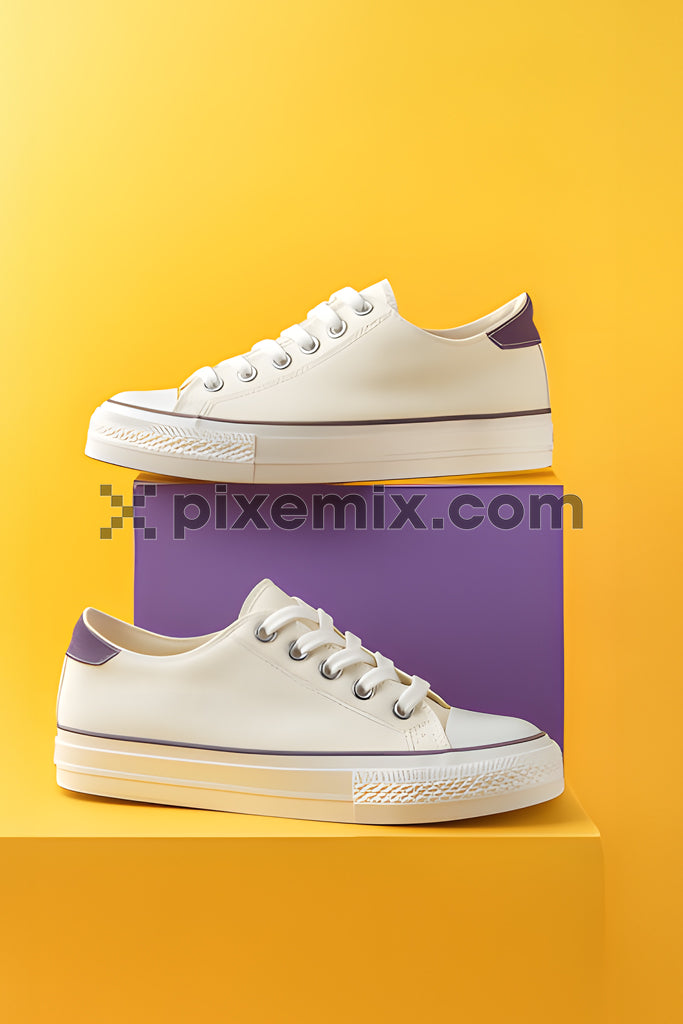 Minimalist white sneakers with purple accents displayed against vibrant yellow and purple color-block background.