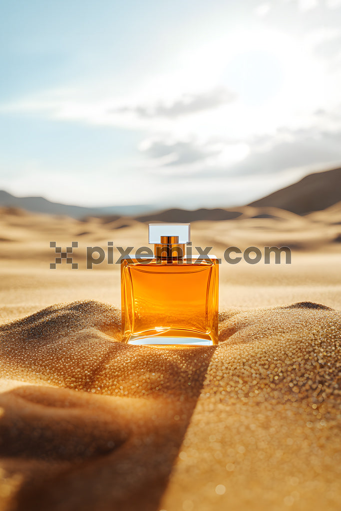 Elegant amber perfume bottle placed in desert sand under glowing sunlight stock image.