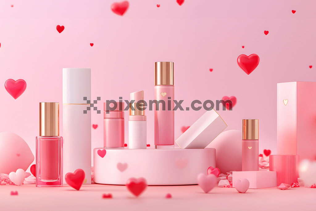Romantic pink cosmetic product display with heart decorations on Valentine's Day background.