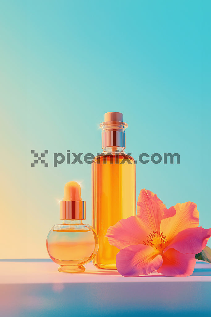 Tropical skincare bottles with hibiscus flower under sunny light and turquoise background.