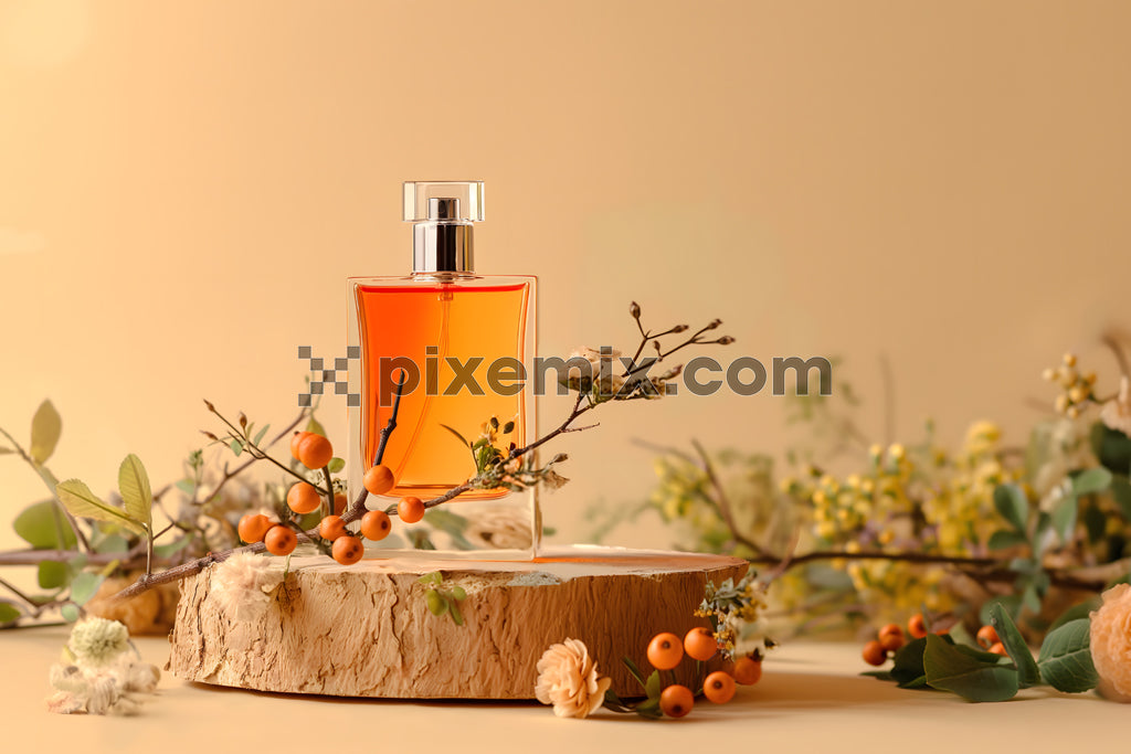 Elegant perfume bottle with floral and berry accents on wooden pedestal in soft beige background.
