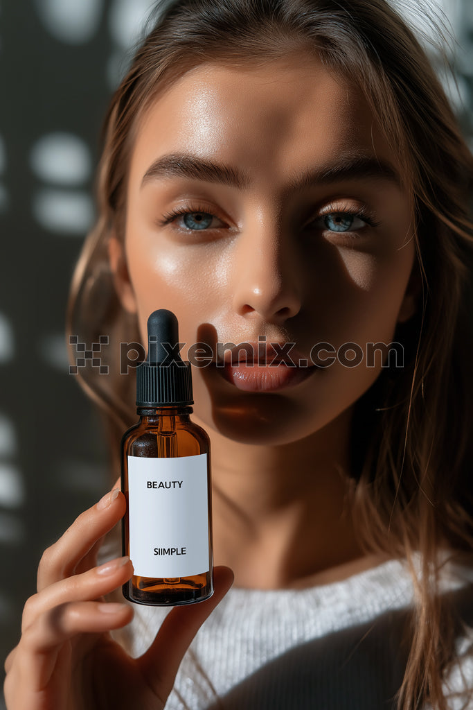 Woman holding skincare serum bottle with minimalist label in natural light stock image.