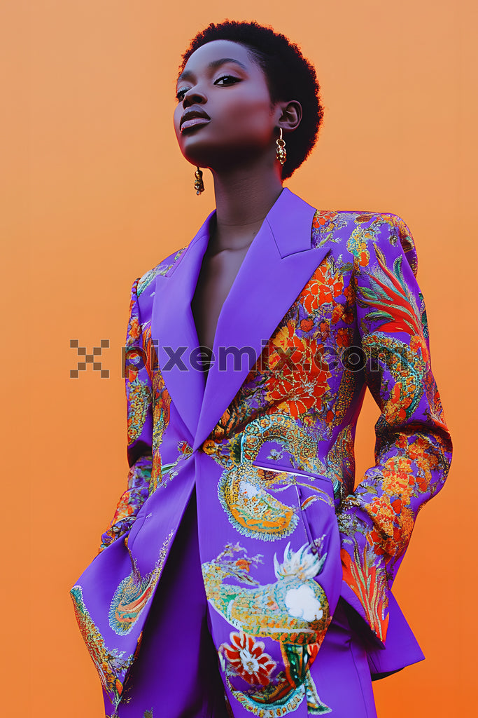 Confident model in vibrant purple embroidered blazer and trousers posing against a bold orange background.