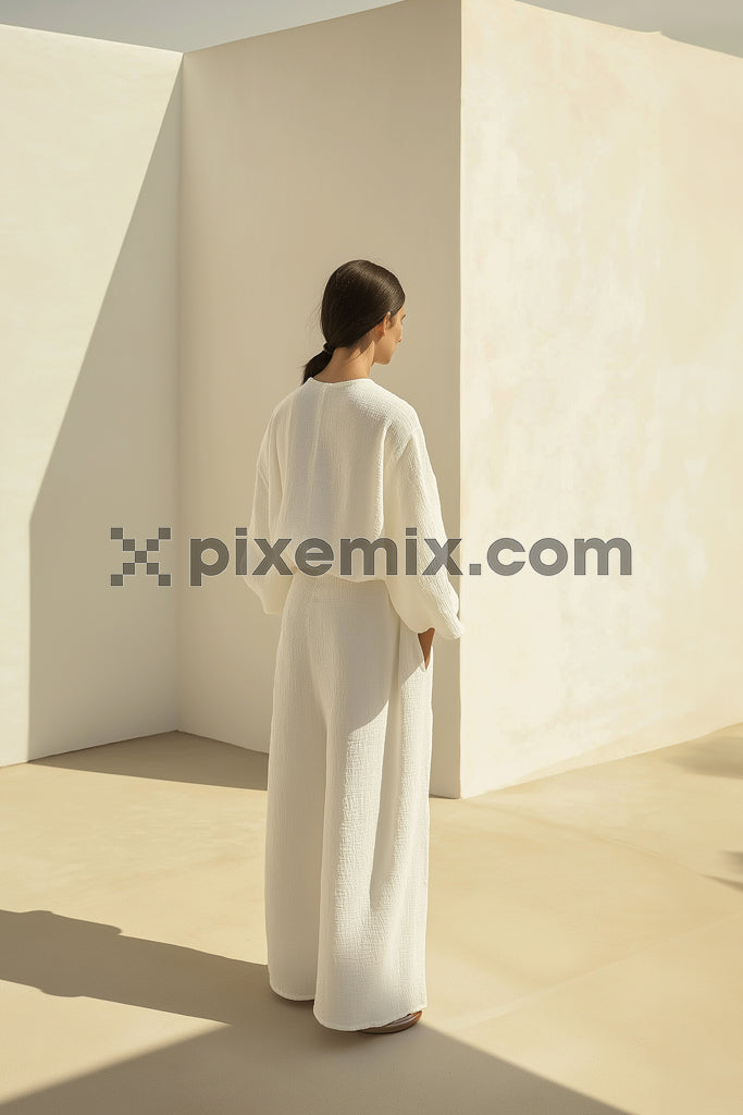 Minimalist fashion model in white outfit standing in sunlit modern architectural space with soft shadows.