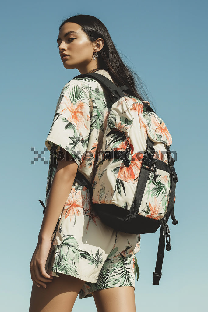 Tropical print outfit and backpack fashion shoot under clear blue sky stock image.