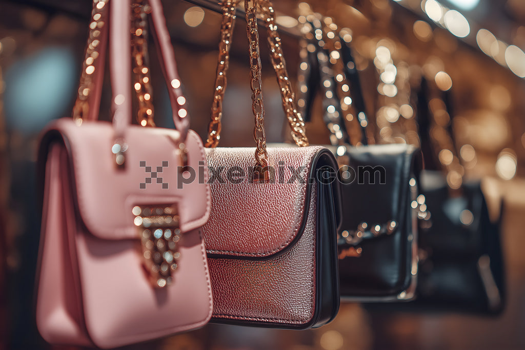 Stylish handbags with gold chains displayed in boutique with elegant lighting and blurred background.