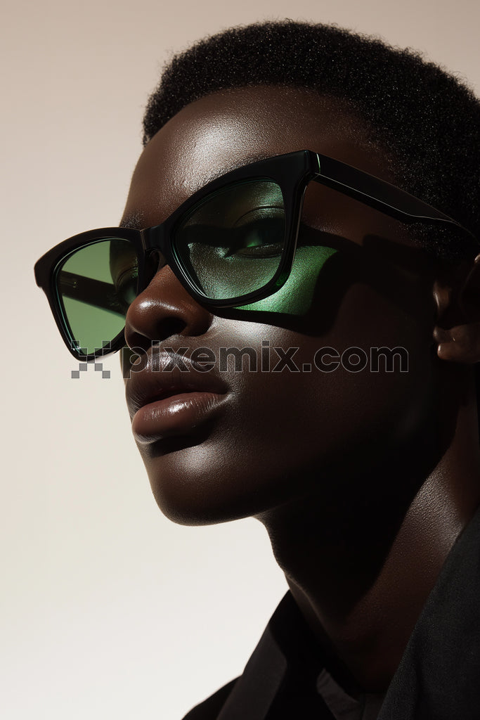 Close-up portrait of a model wearing bold green-lens sunglasses and a black outfit stock image.