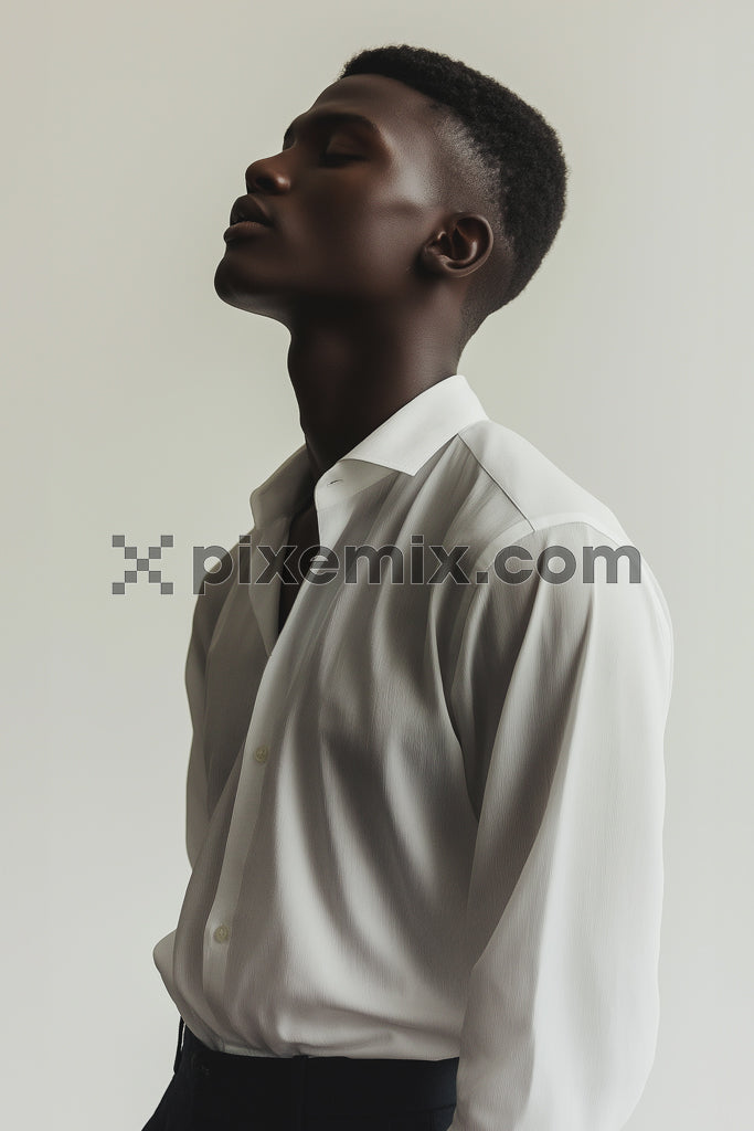 Stylish man in white shirt posing gracefully against minimalist background stock image.