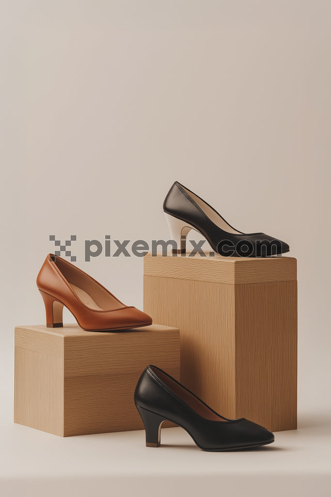 Elegant leather high heel shoes displayed on wooden blocks in minimal studio setup.