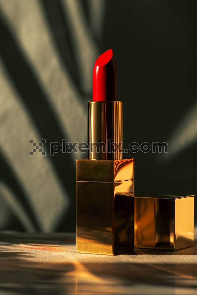 Luxury red lipstick in golden case with dramatic shadows stock image.