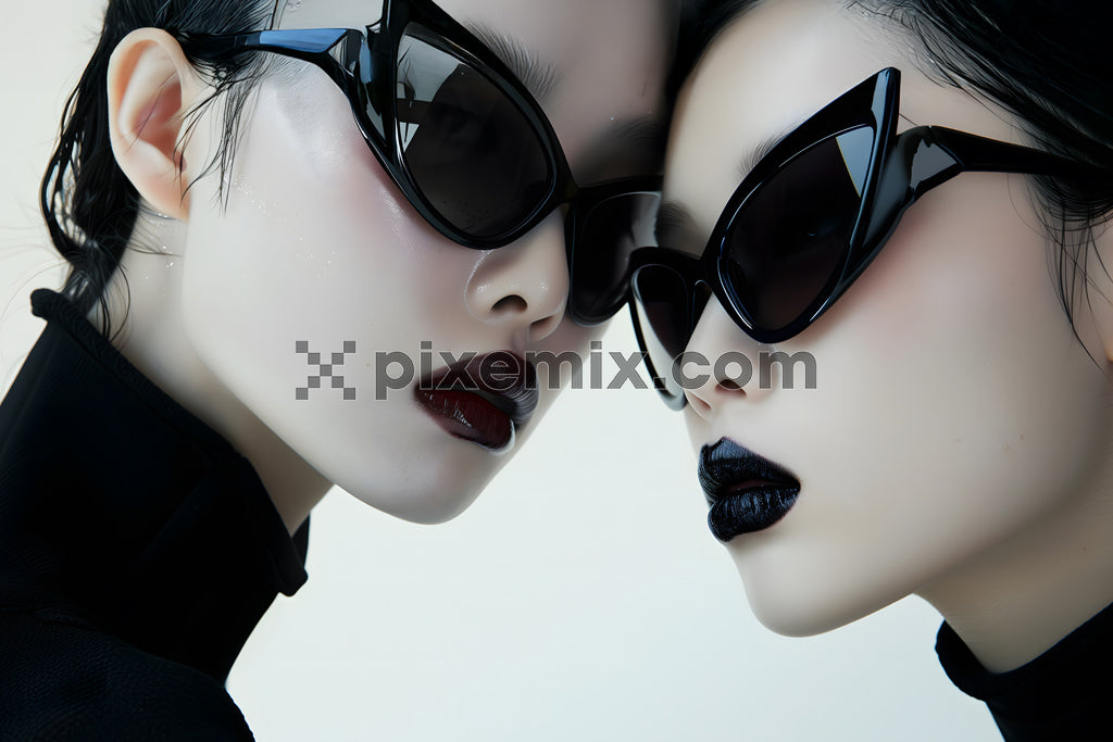 Two fashion models in black outfits and sunglasses with bold lip stock image.