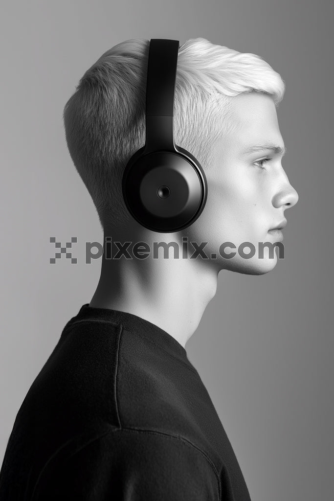 Profile of young man with black over-ear headphones on minimalist gray background.