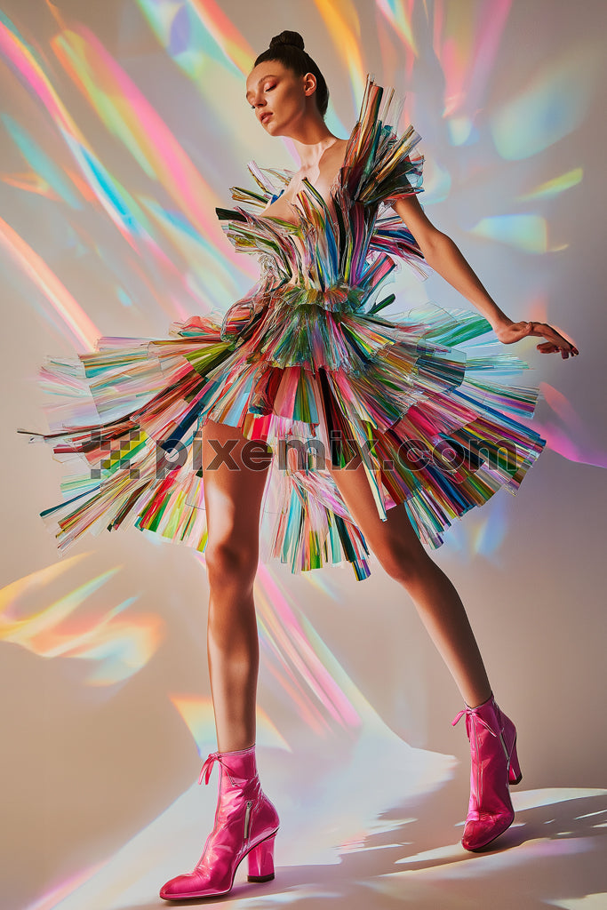Futuristic fashion model in avant-garde rainbow plastic dress and pink boots stock image.