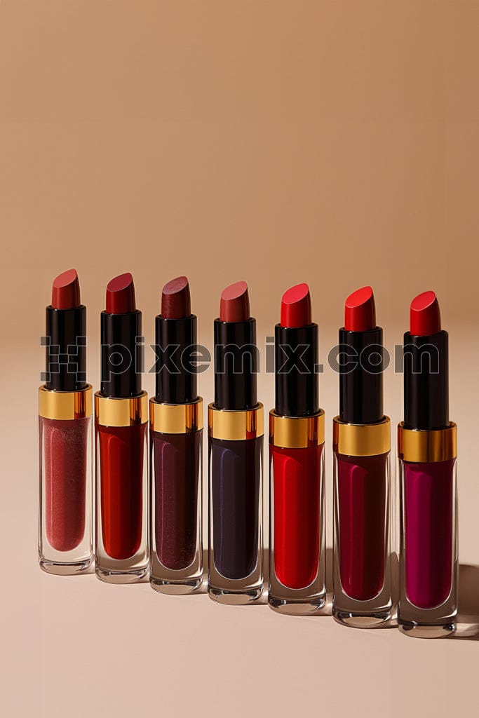 Bunte Lippenstifte auf beigem Hintergrundbild.
