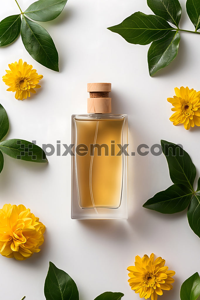 A sophisticated glass perfume bottle with golden liquid, elegantly arranged with fresh green leaves and vibrant yellow flowers on a white background.