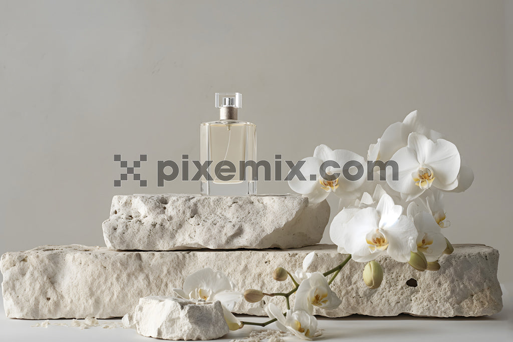 A minimalist and luxurious perfume display featuring an elegant glass bottle among white orchids and textured stone.