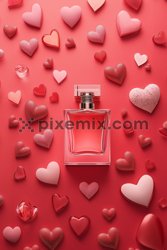 Elegant Perfume Bottle on Red Background with Romantic Hearts stock images.
