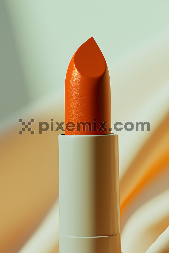 Close-up of an orange lipstick in a sleek, minimalist case, set against a soft background.