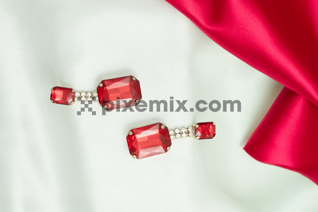 Elegant red gemstone earrings with diamond accents on luxurious white and red satin fabric stock image.
