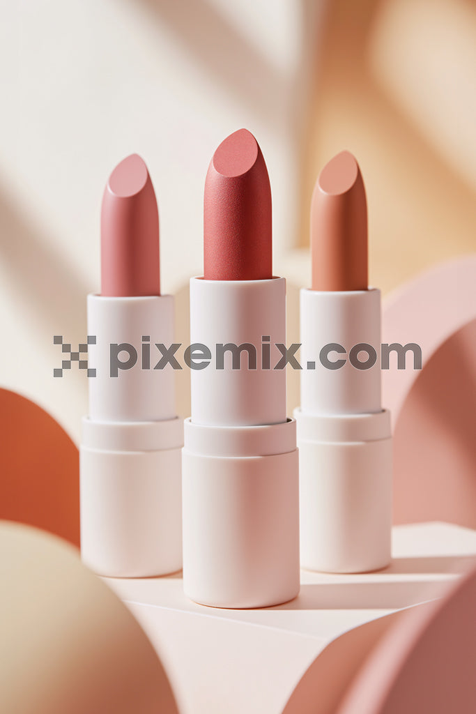 Elegant lipstick trio in soft, neutral tones with minimal packaging stock image.