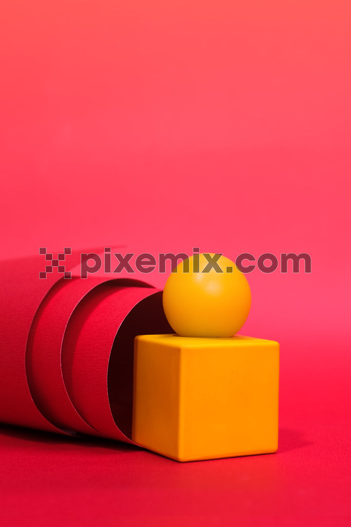 Yellow cube and sphere on a red background with rolled paper stock image.