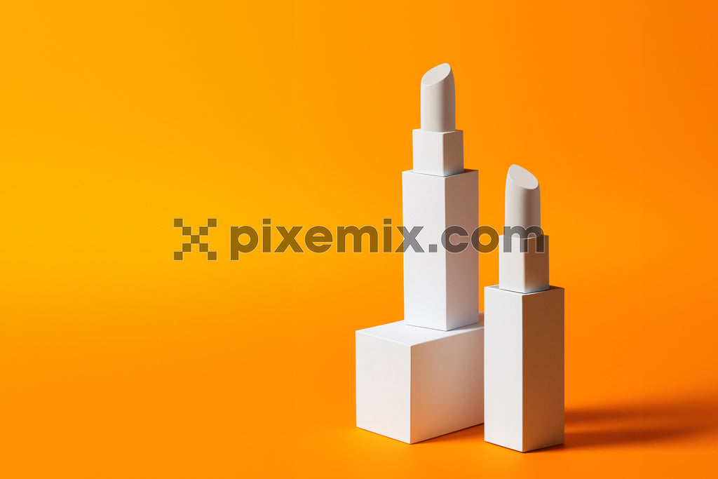 Minimalist white lipstick mockup on vibrant orange background stock image.