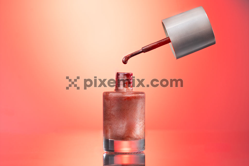 Shimmery red nail polish bottle with applicator brush against a gradient red background stock image.